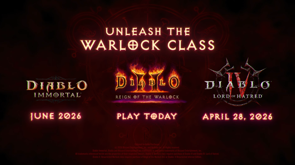 • Diablo IV – Expansão Lord of Hatred: O Warlock chega a Santuário no dia 28 de abril de 2026.